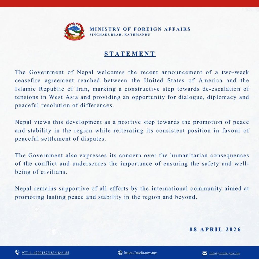 Kathmandu: Nepal has welcomed the recent announcement of a two-week ceasefire agreement reached between the United States of America and the Islamic Republic of Iran.